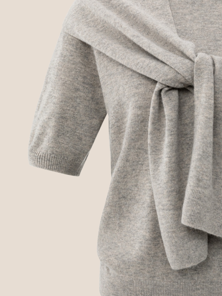 01-000496-509 van het merk YAYA in de kleur brownish grey Deze trui met korte mouwen is uitgevoerd in een zachte gebreide stof en heeft een normale pasvorm met ronde hals. Het vaste sjaaldetail dat over de schouders valt en aan de voorkant gestrikt is, geeft het item een speels en trendya ccent. Ideaal voor een casual maar doordachte look.