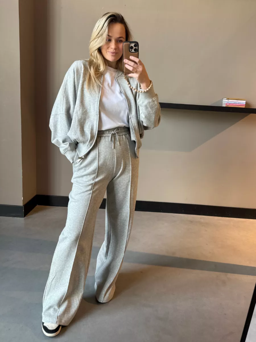 Carlijn jogger set van het merk Ambika in de kleur grijs. Dit is een een heerlijk comfy pak bestaande uit een vest met rits en een rechte pantalon met zakken.