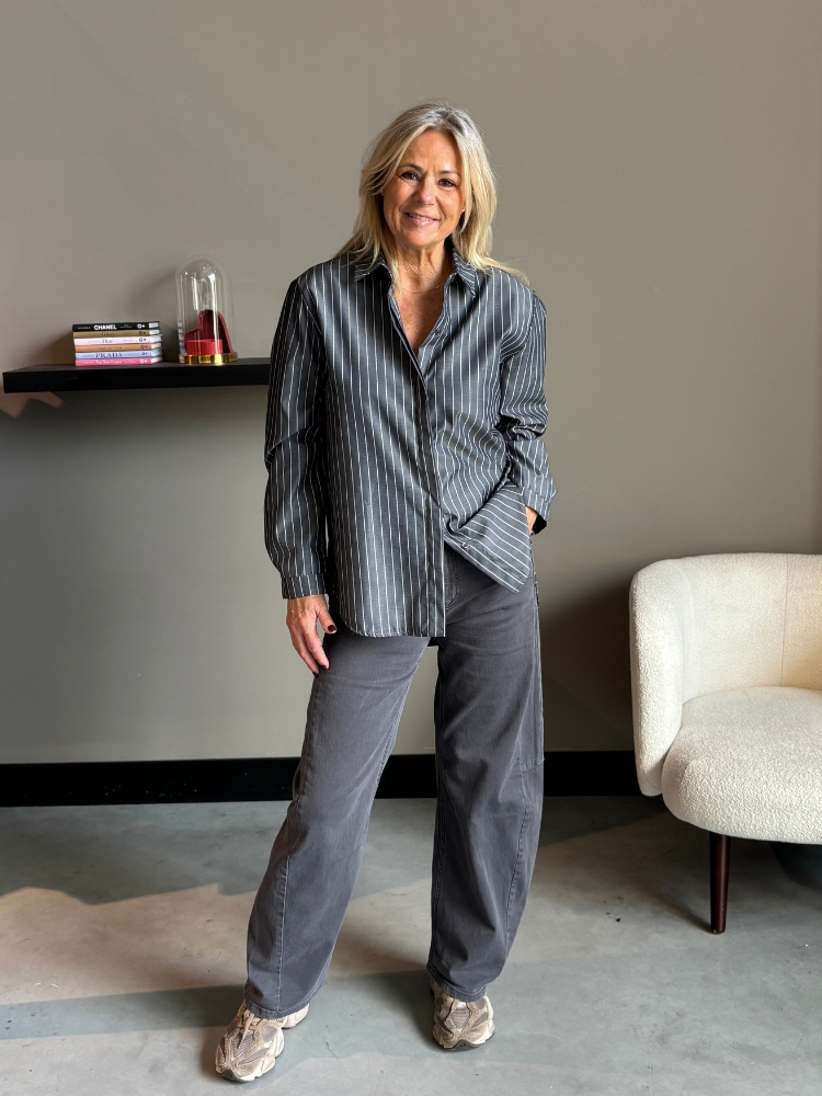 De Streep Blouse Lua in grijs met witte strepen is een stijlvolle blouse met een klassieke kraag en een verborgen knoopsluiting aan de voorkant. De blouse heeft een losse pasvorm en is onesize, waardoor hij comfortabel draagt en mooi valt. Gemaakt van een zachte stof met lichte stretch voor extra draagcomfort. Leuk te combineren met een pantalon voor een nette, maar casual look.