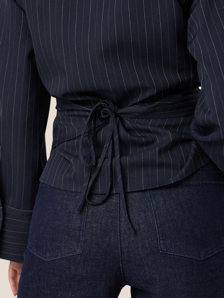 Ibana Tatum pinstripe blouse van het merk Ibana in de kleur Dark Sapphire. Is een elegant omslagblouse met kraag, trompetmouwen en rondom de taille een strikkoordsluiting. Deze blouse valt gemakkelijk te stylen met een donkere jeans, en zorgt voor een galante vrouwelijke uitstraling.