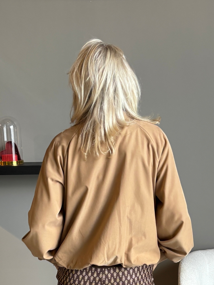 Jas Daisy van het merk Frenkie the Label in de kleur camel. De jas heeft lange mouwen, een omgeslagen kraag, steekzakken aan de zijkant, gaat dicht d.m.v. een knoopsluiting en is aan de binnenkant gevoerd met een paisley patroon.