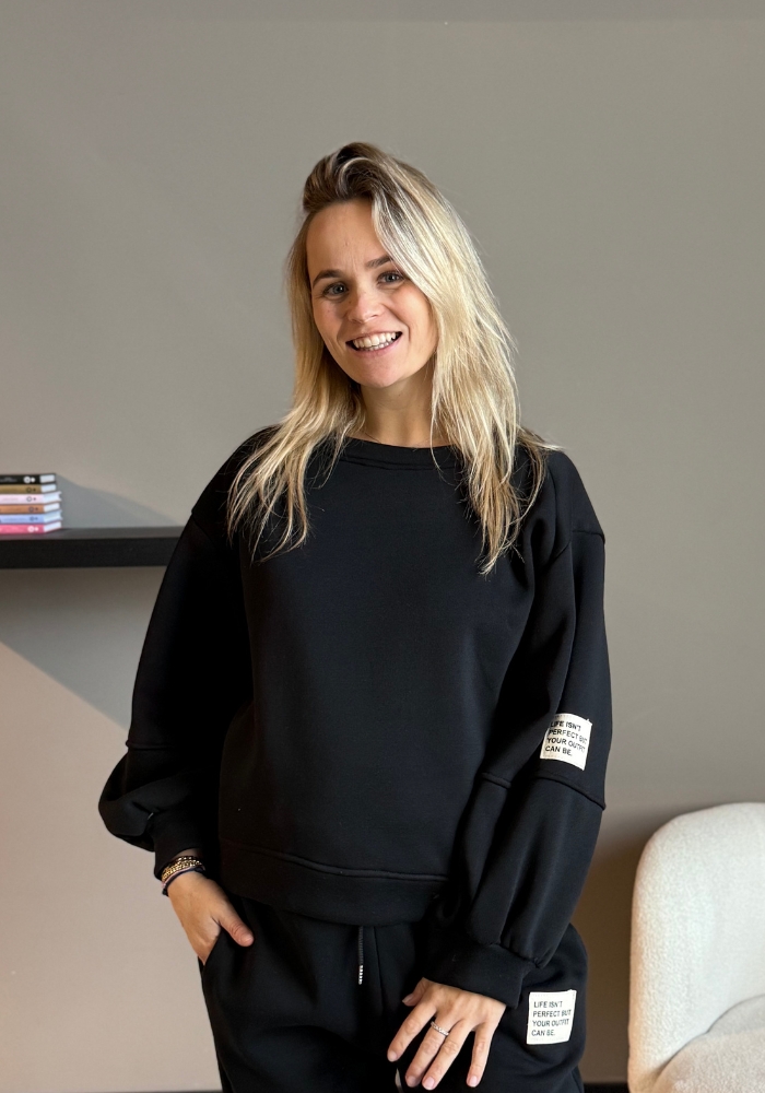 Jog Set Romy in de kleur zwart. De Jog Set Romy is een comfortabele onesize set met een zachte binnenkant en een losse pasvorm. De set heeft een leuk detail op de mouw en op de broek, met de tekst “Life isn’t perfect but your outfit can be.” Een stijlvolle en cozy outfit die niet mag ontbreken in je garderobe.