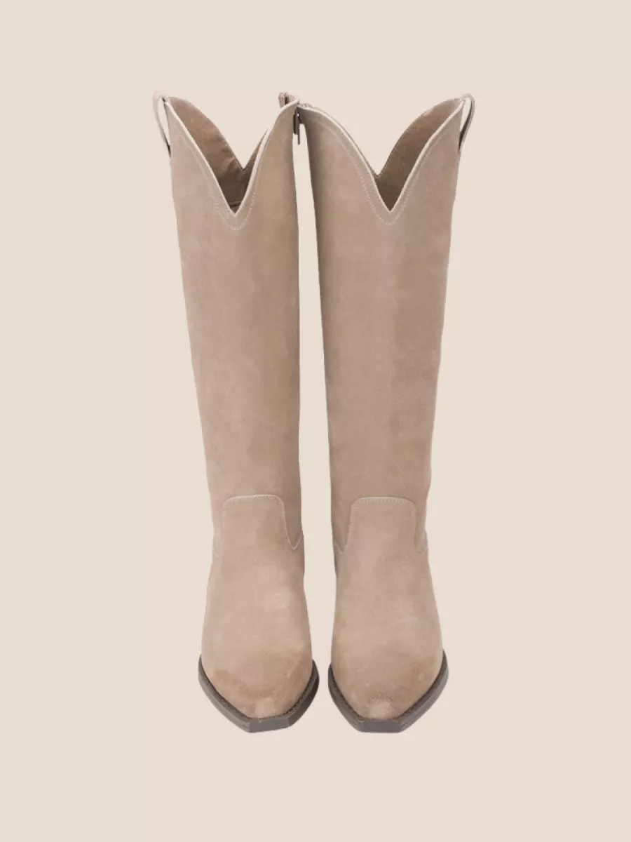 Dana cowboy laarzen van het merk Poelman in de kleur beige. Deze hoge suède westernlaarzen met puntige neus, V-schacht en blokhak combineren moeiteloos cowboy vibes met city-chic. Perfect te dragen bij een denim rok of een flowy jurk – comfortabel, cool en veelzijdig.