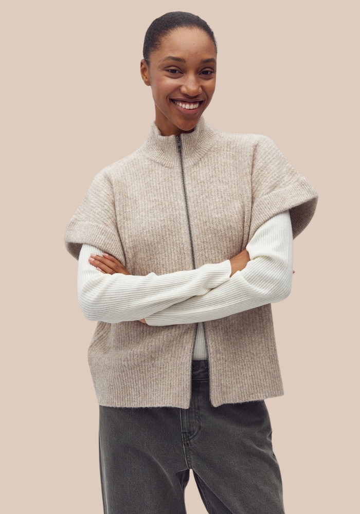 Het Roselina vest van mbyM is een gebreid vest met korte mouwen en een praktische tweewegrits aan de voorzijde. Het model is gemaakt van een zachte wolmix en heeft een comfortabele pasvorm die ideaal is voor dagelijks gebruik.
