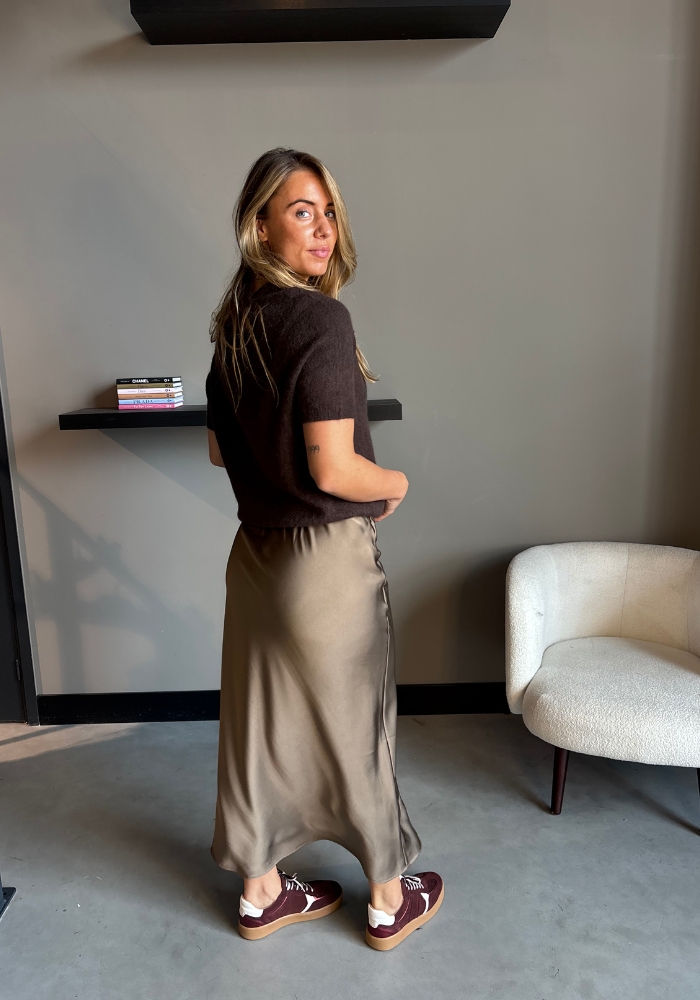 De Frederque rok is een elegante satijnen rok in de kleur taupe. Dankzij de vloeiende stof en de losse pasvorm valt de rok mooi langs het lichaam en zorgt hij voor een vrouwelijke uitstraling. De rok is lang van model en kan zowel casual als chic gedragen worden, afhankelijk van hoe je hem combineert.