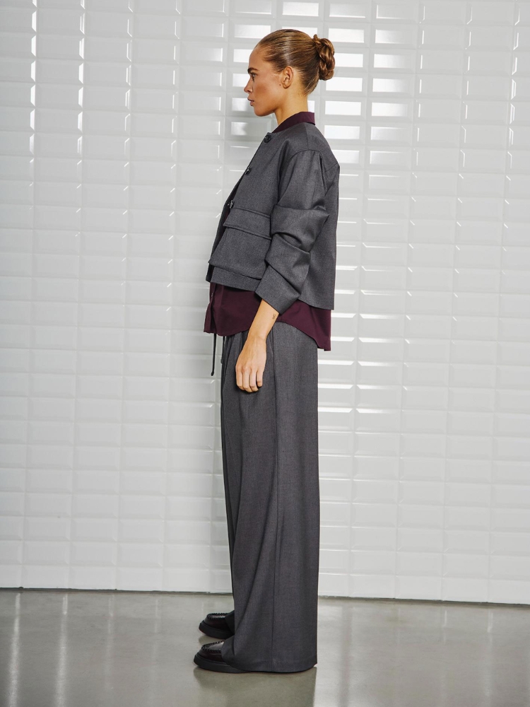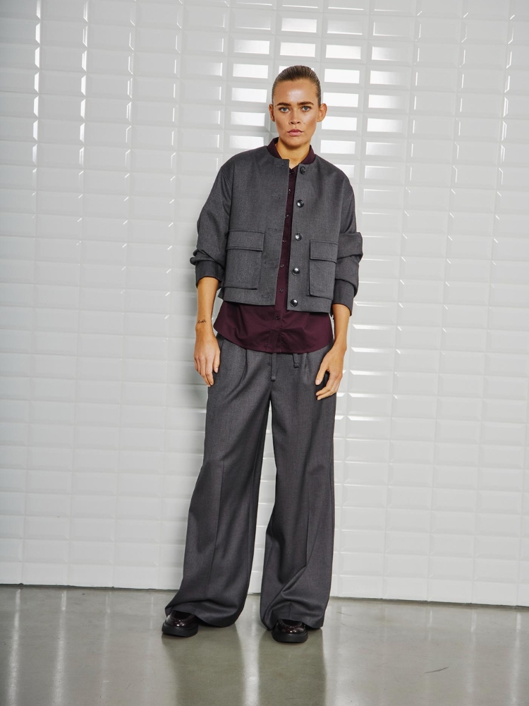 Jack van het merk With Black in de kleur grijs. Deze jas is gemaakt van een mix van wol en Tencel en heeft een ronde hals met verlaagde schouders. Het model sluit met vijf knopen en is voorzien van opbergzakken met klep en een schouderpas aan de achterkant. Met een normale pasvorm en een lengte net onder de taille is dit een veelzijdige jas voor elke garderobe.