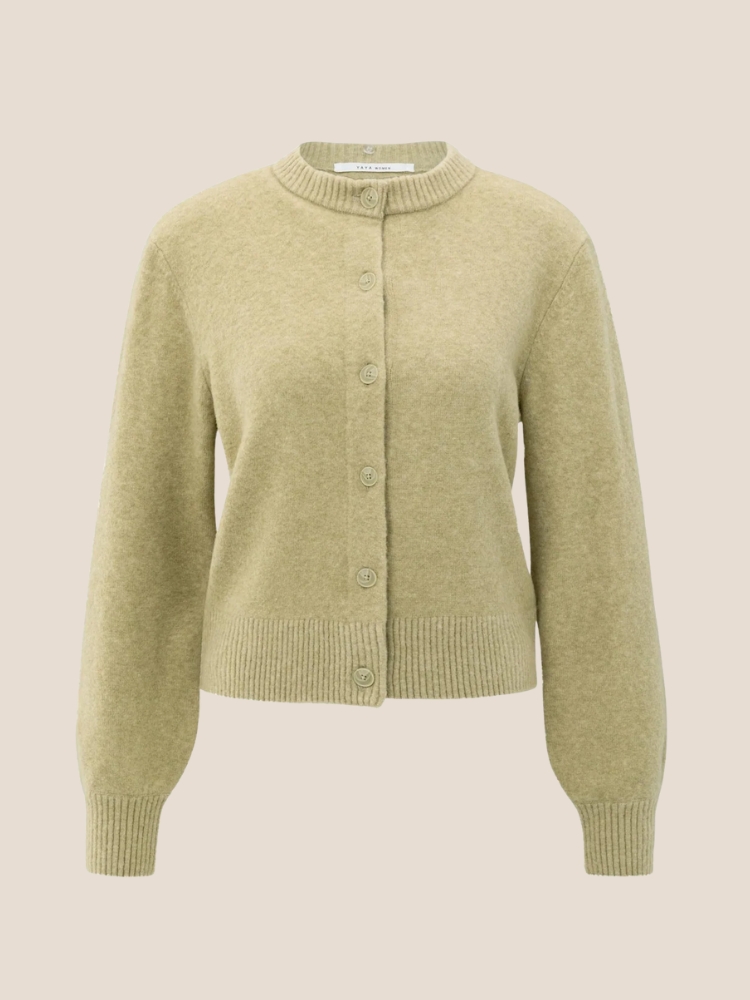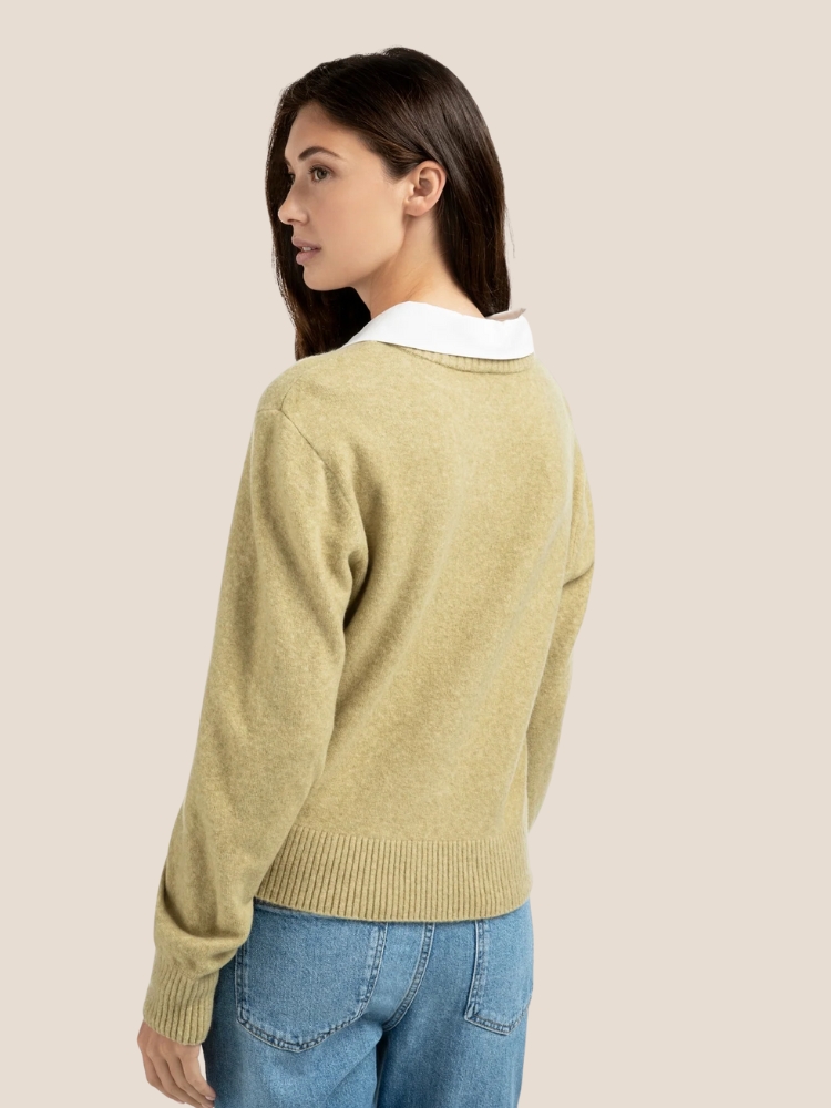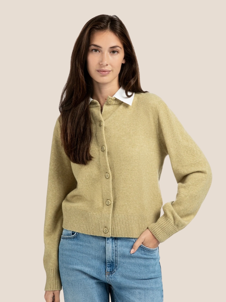01-010117-509 van het merk YAYA in de kleur Pale olive green. Dit elegante vest is vervaardigd uit een zachte gebreide stof en voorzien van een klassieke knoopsluiting. De afneembarem witte kraag van geweven katoen zorgt voor een stijlvolle, gelaagde look. Het vest heeft lange mouwen, een normale pasvorm en ribdetails aan de boorden.
