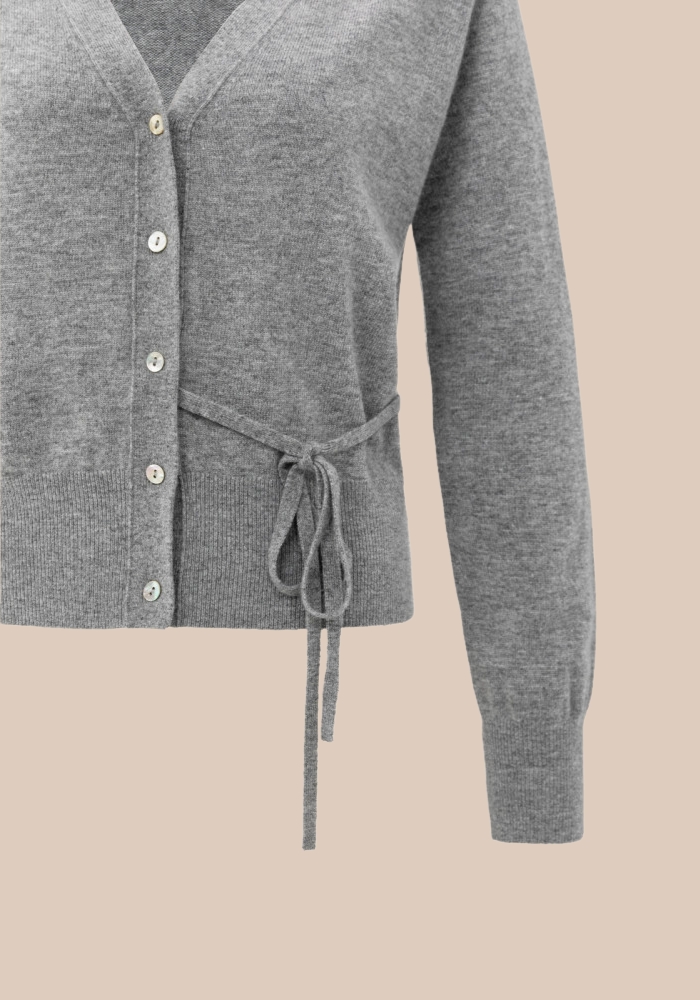 Yaya 01-010122-508 Vest met strikdetail in de taille in de kleur medium grey melange. Dit zachte, gebreide vest heeft een diepe V-hals, knoopsluiting en een elegant strikdetail in de taille. Dankzij de lange mouwen en ribboorden zit het comfortabel en heeft het een normale pasvorm. Een veelzijdig item dat zowel casual als chic te dragen is.