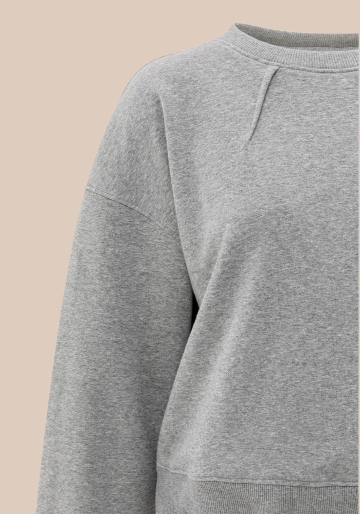 Yaya 01-109094-508 Sweater met plooidetails en strikkoord aan de zijkant in de kleur medium grey melange. Deze zachte sweater heeft een losse pasvorm, verlaagde schouders en een ronde hals. Aan de voorkant zorgen twee subtiele plooidetails voor een verfijnde uitstraling. De zoom is aan één kant voorzien van een strikkoord, waarmee je de vorm licht kunt aanpassen. Afgewerkt met geribde boorden.