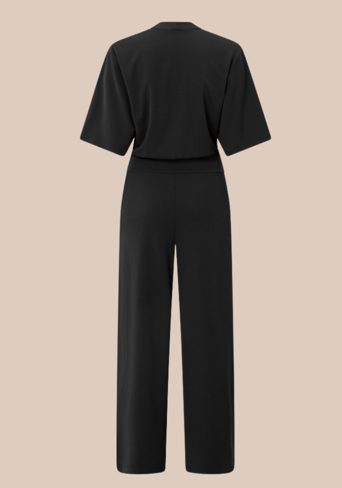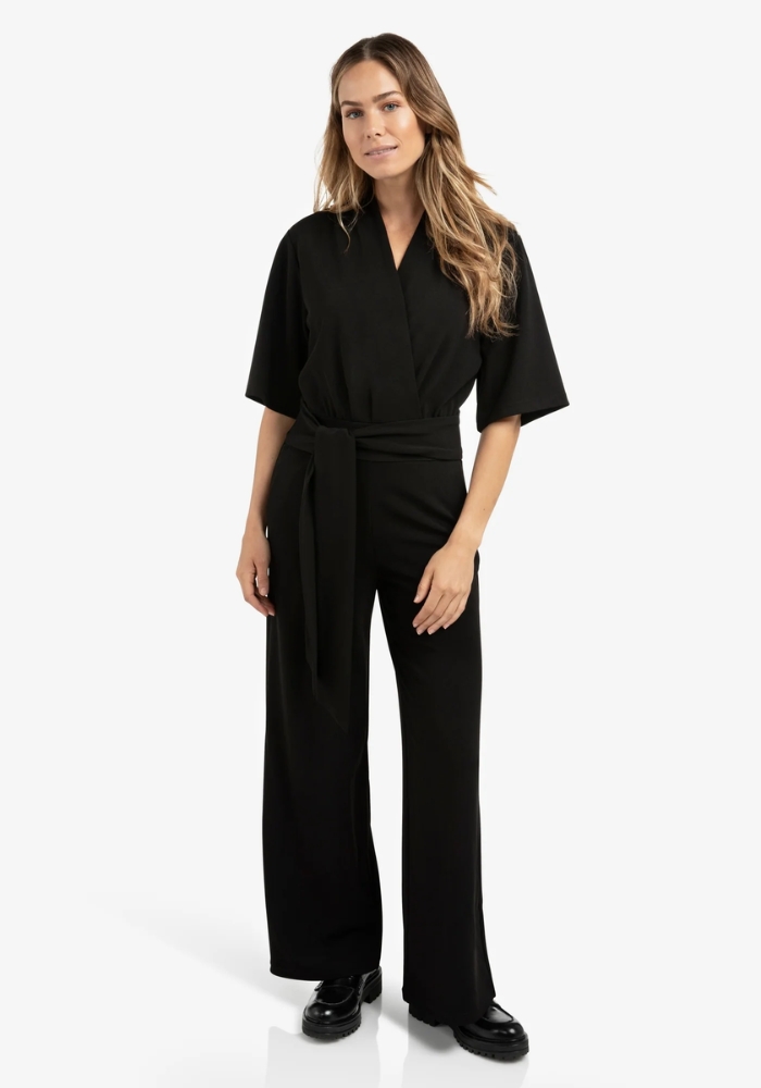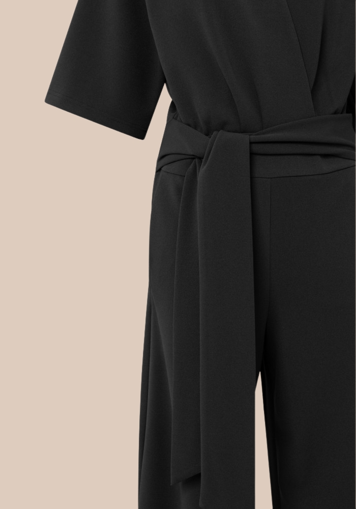 yaya 01-349023-511 Jersey jumpsuit met korte mouwen en strikceintuur zwart