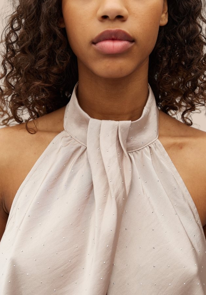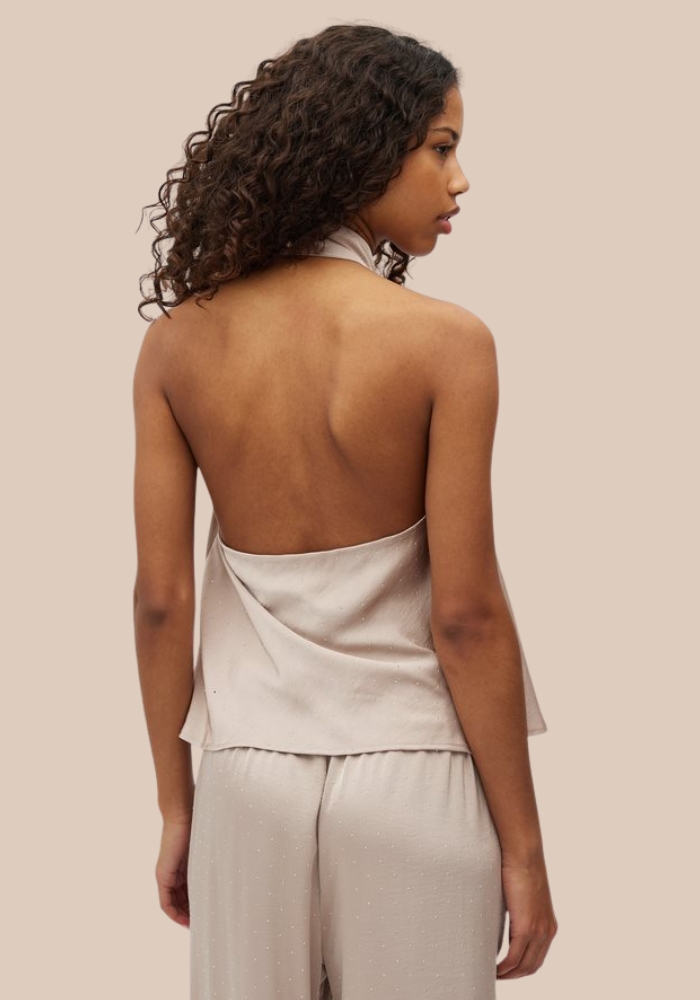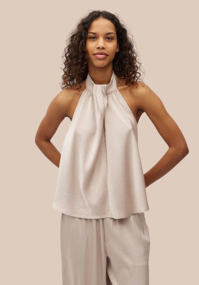 De Zuzela-M top van mbyM is een elegante mouwloze top in de zachte kleur light sand, met een subtiel knoopdetail bij de hals. De top heeft een losse pasvorm, sluit met knoopjes in de nek en heeft een diepe rug voor een speels effect.